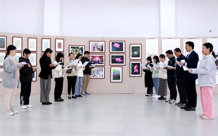 最后,师生们来到大学生活动中心三角梅书画展厅,一起参观学校的廉洁书画作品展和清廉榜样先进事迹展。看着一幅幅书画作品,廉洁之风沁入人心。在莲花摄影作品前,师生们深情朗诵《爱莲说》,让廉洁文化更“走心”。